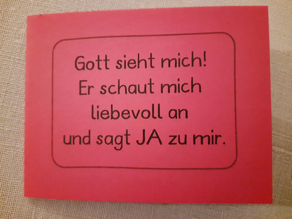 Mit einem Staunen und einem leisen Lächeln ging es weiter, als jedem Kind eine Karte überreicht wurde. Beim Öffnen des Kärtchens erblickten sie sich selbst, umrahmt in einem Spiegelherz. Nun war jedem klar: Gott sieht mich! Er schaut mich liebevoll an und sagt JA zu mir.